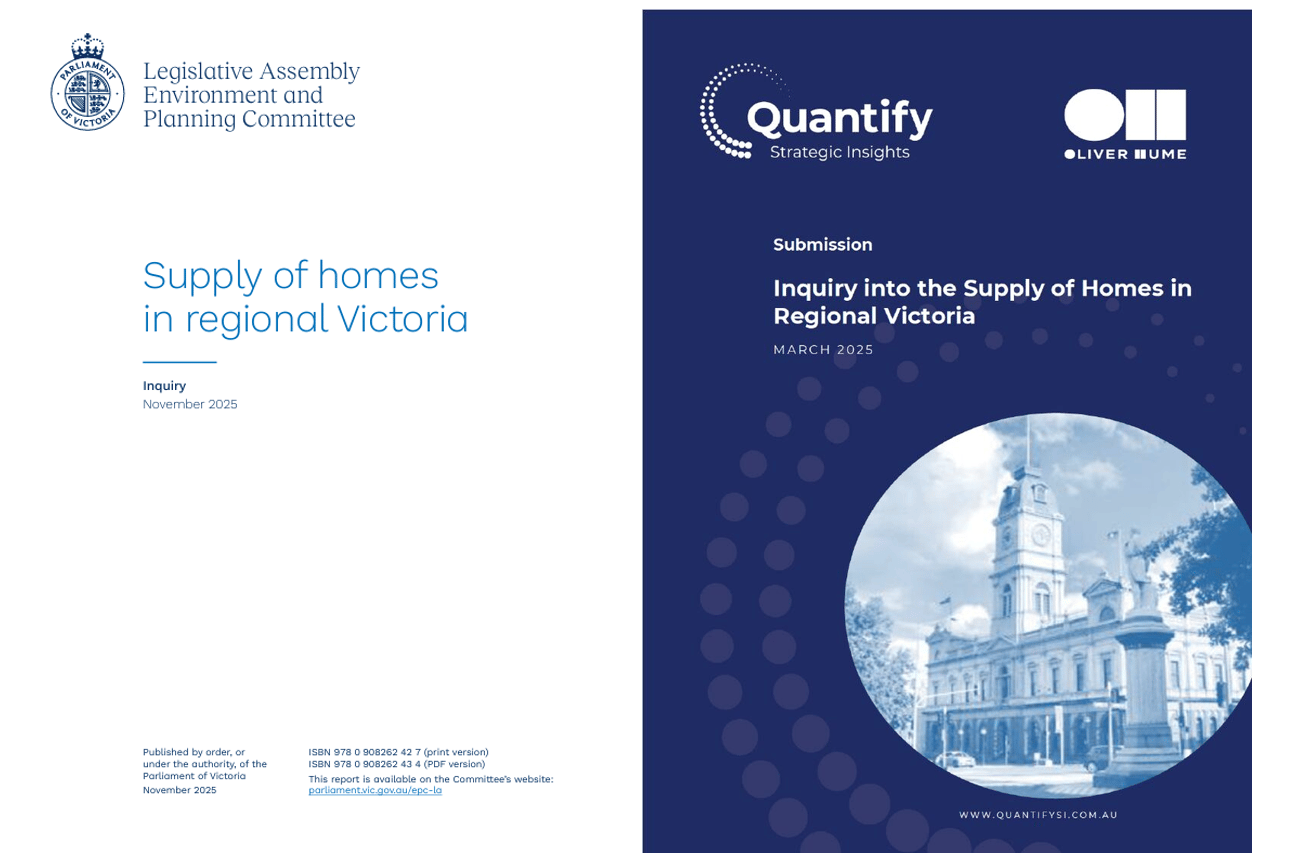 The Victorian Parliament’s Inquiry into the Supply of Homes in Regional Victoria has now released its report, with the submission prepared by Quantify Strategic Insights in partnership with Oliver Hume featuring prominently throughout.