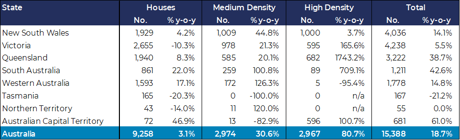 Queensland (+39%) and South Australia (+43%) did the heavy lifting, recording the largest year-on-year increases in total dwelling approvals. Together with Western Australia, there has been solid growth in new house and Medium Density approvals in these markets over the past twelve months, although it appears that the pick up in house approvals in Western Australia may be slowing, while Medium Density approvals in South Australia have been recently flat.