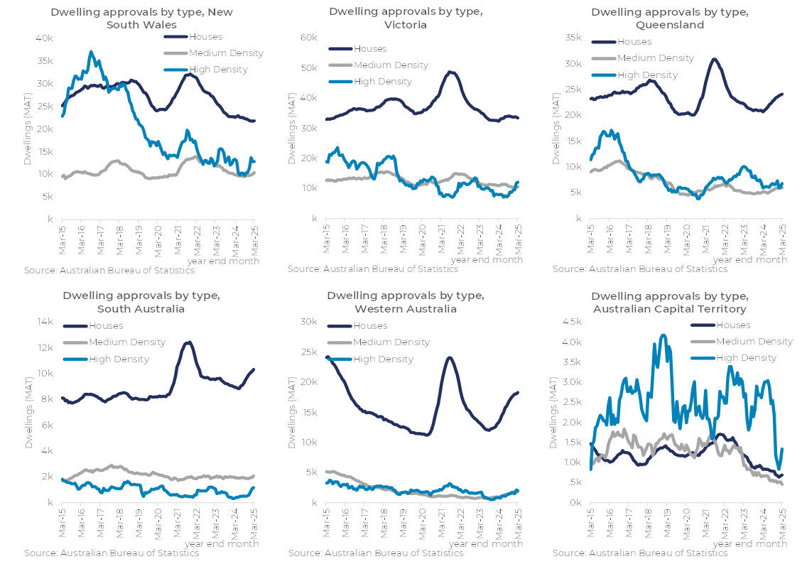 House approvals (up 10%) and Medium Density Dwellings (+6%) have shown a moderate increase from their previous lows, while there has been a 31% pick up in High Density approvals (from 27,800 in year to June 2024, to 36,300 in year to March 2025).