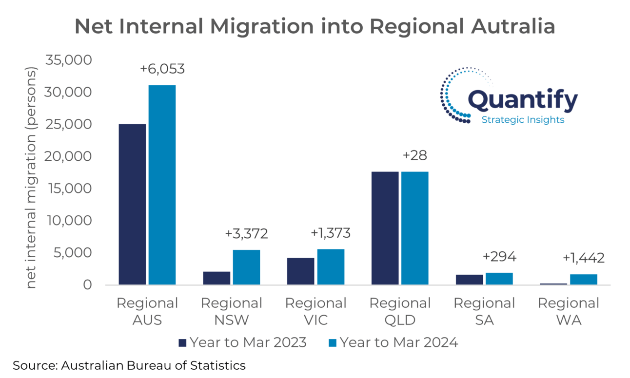 The Australian Bureau of Statistics reports that net internal migration inflows outside of Australia’s capital cities increased by 24%, from 25,140 in the year to March 2023, to 31,190 in the year to March 2024, or by 6,050 persons year-on-year.