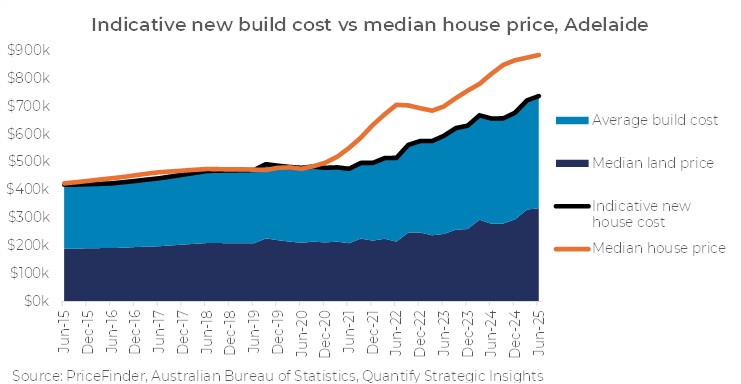 As the chart below shows, over 2015–2020, the indicative cost of a new house in Adelaide (land + build) was similar to the median established house price, rising from around $420,000 in 2025 to $480,000 or so by 2020. However, by June 2025, the median price of a new house, at $885,000, was well over the indicative new house price of $738,000 (median land price of $335,000 plus average build price of a new home of $403,000).