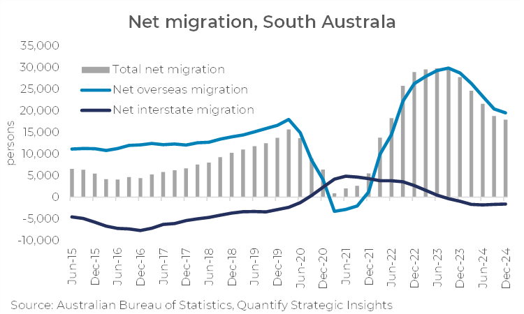 In addition, the population fundamentals are further supporting new housing demand. Net overseas migration remains above pre-COVID levels, although is easing. Similarly, South Australia experienced a net interstate migration inflow for the first time since the early 1990s over 2020–2023. While a net interstate migration outflow has returned, it remains lower than pre-COVD levels. As a result, total migration, and therefore population growth, remains elevated.